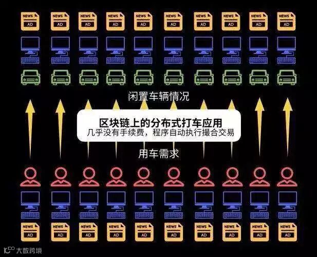 如果有一个区块链上运行的打车应用,这20%~30%的手续费将会省去,其运行模式是这样的: