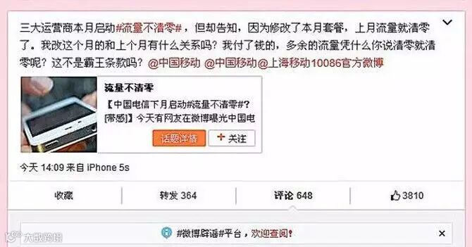 11月1日,一位知名女艺人发微博称,因为修改了本月套餐,上月流量就被清零了,因此斥责运营商移动公司“清零”不痛快。“我改这个月的和上个月有什么关系吗?我付了钱的,多余的流量凭什么你说清零就清零呢?这不是霸王条款吗?”随后她又转发该微博,用吃饭打包来比喻运营商的不合理条款:“午餐点了5个菜,吃不完,要打包3个。寻思晚餐怕浪费少点两个。结果说,晚餐不点满5个就不让打包中午的3个菜。神一样的逻辑。”该微博发出后受到不少网民的支持。