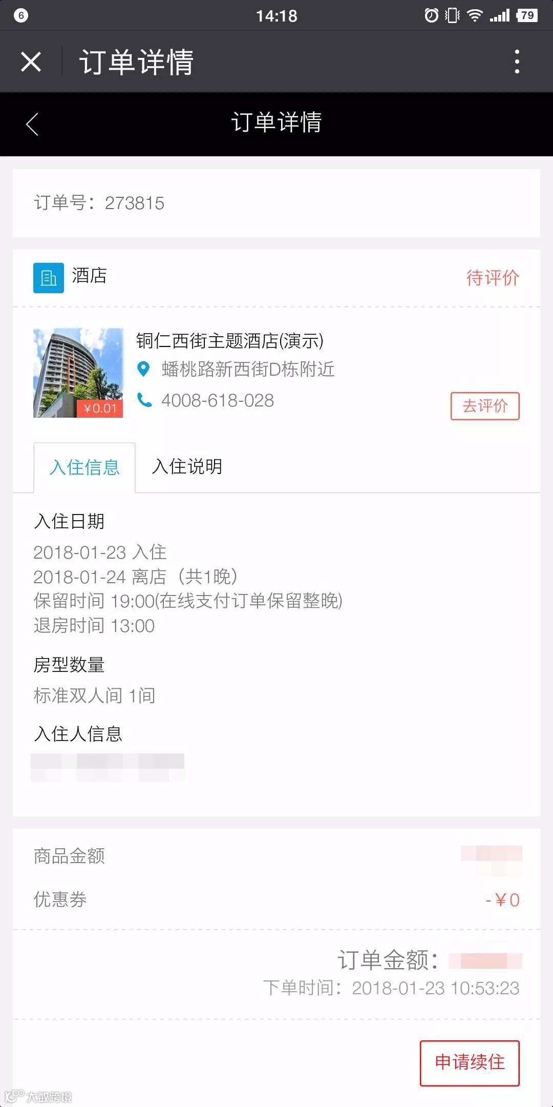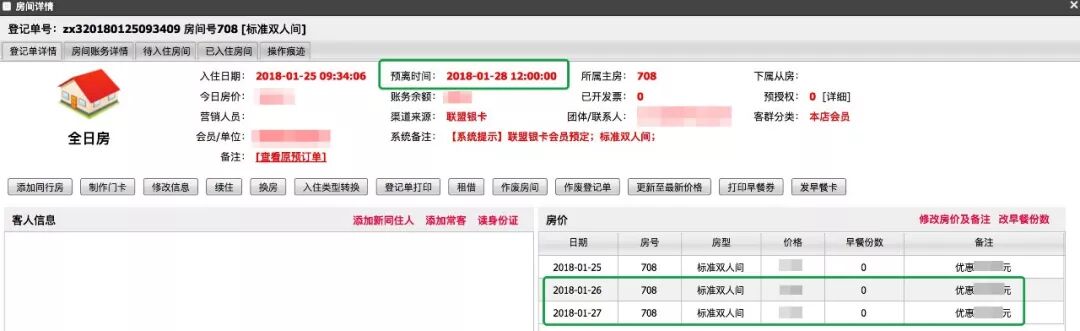 房间预离时间自动延长至续住离店时间,房价也会自动增加续住房费信息。