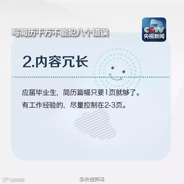 在浙江某招聘会上负责“会诊”的王老师表示,一个熟练的HR浏览简历的时间只有十几秒,只与你交谈几句。因此,减少简历上突出的明显问题,避免出现无用信息掩盖重要信息、排版倾斜45度、夸大自己能力等“奇葩”简历的情况。注意到下列常出现的8大错误,也许就能让你的简历脱颖而出!