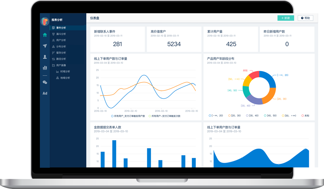 具备事件分析、漏斗分析、用户分析等7种深度分析,可灵活自定义报表,并支持一键下载。