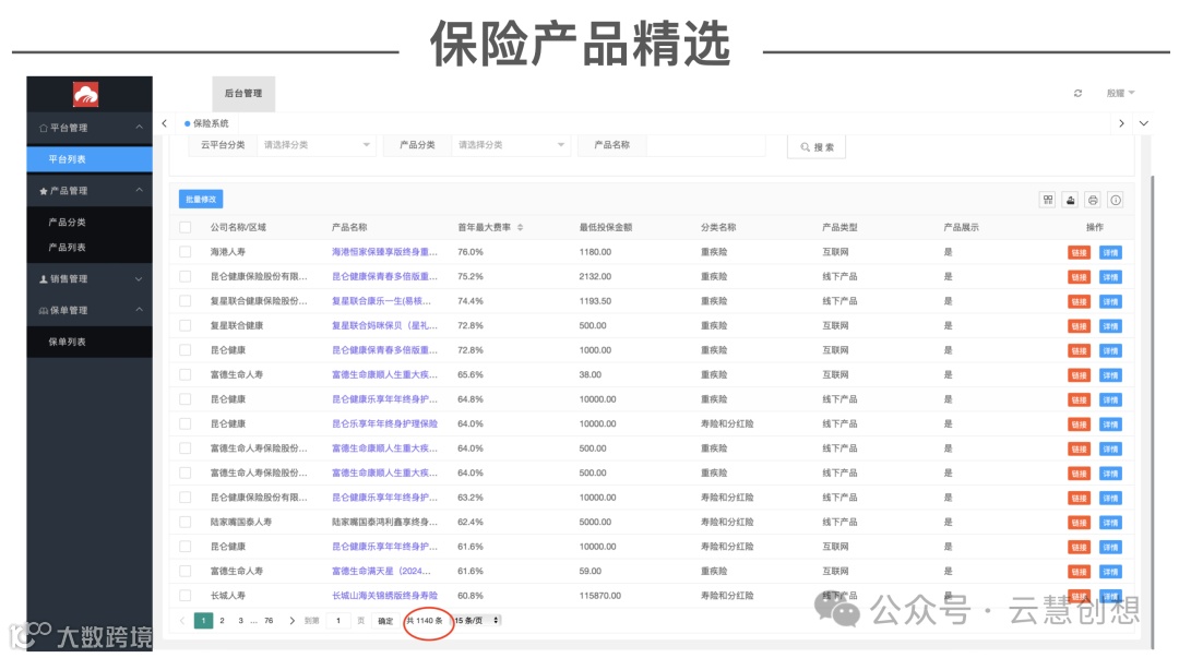 云慧创想自主研发了扎根于保险中介行业的云服产品库系统,可以为机构和经纪人提供专属的产品平台和保单数据管理系统,并可以完成私域云化部署。支持跨平台的产品聚合能力,保险产品投保链接一站式管理,保险公司、经纪公司和第三方互联网保险平台数据直连;主流展业平台佣金对比,展业账户链接自动配置。