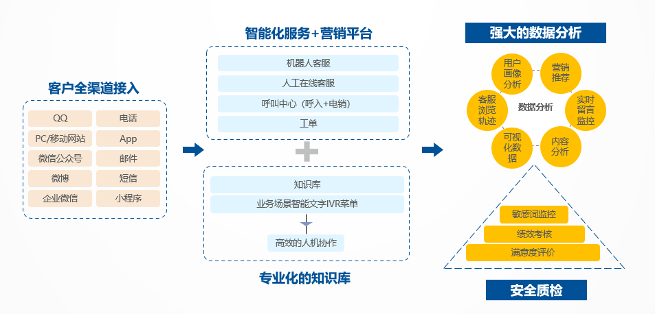 客服系统智能化程度低,常见问题重复率高,服务效率低;多个渠道对外开放,导致信息分散难统一,需要大量人工成本支撑客服工作。