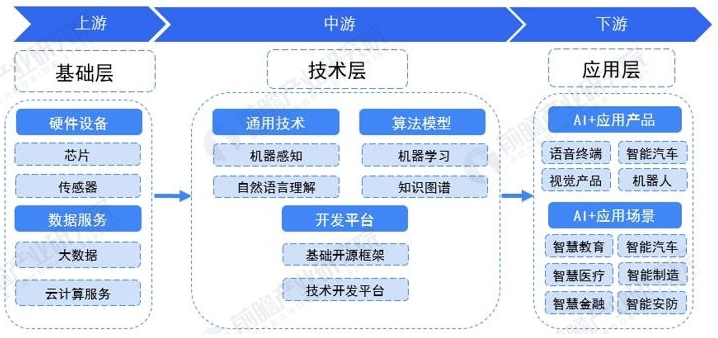 产业链方面,人工智能产业链上游主要包括硬件设备和数据设备,如芯片、传感器、大数据和云计算服务等,为AI提供必要的数据服务和算力支持。中游是技术核心,涵盖机器感知、自然语言理解等核心技术。下游则是应用产品和场景,如交通、医疗、安防等领域