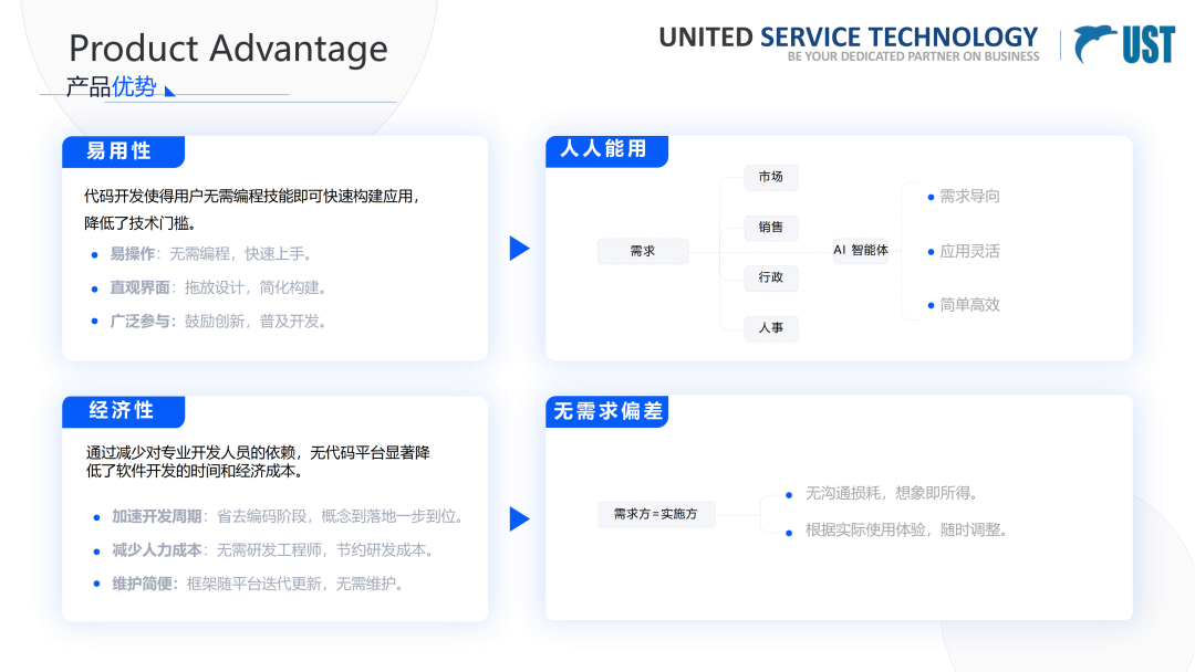 融合高新前沿技术与成熟场景应用,是联合汇重点打造的平台整合能力。比如,通过AI改造传统业务流程,并结合无代码搭建能力,让大模型产品真正在企业内部用起来。其中,三款办公自动化产品,通过大模型更强的人机交互能力,改造企业经营传统流程,让企业更好地应对易变、复杂、模糊的内外部困难;通过整合大模型与商业智能分析,让企业与员工应用数据的时间成本数倍降低,提升基层员工数据治理能力。