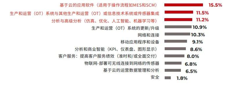 随着数字化转型在行业间的持续推进,工业企业开始重视OT领域的投资,尤其是OT与ICT的融合。而在OT技术相关的投资计划中,前三大的投资重点是基于云的应用软件、OT技术和ICT技术或传感器的集成以及分析和高级分析。