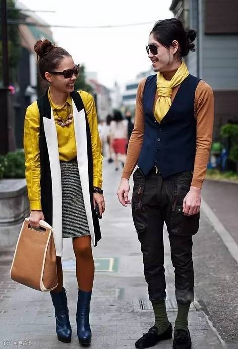 1. 最简单的色彩呼应就是基础色(黑白灰)+一种亮色搭配的搭配。因为两个人全身上下除了基础色之外只有一种颜色,所以视觉上这个颜色就能够迅速抓住眼球,两人身上这个被highlight出来的颜色就会自然的给人一种情侣装的呼应感。