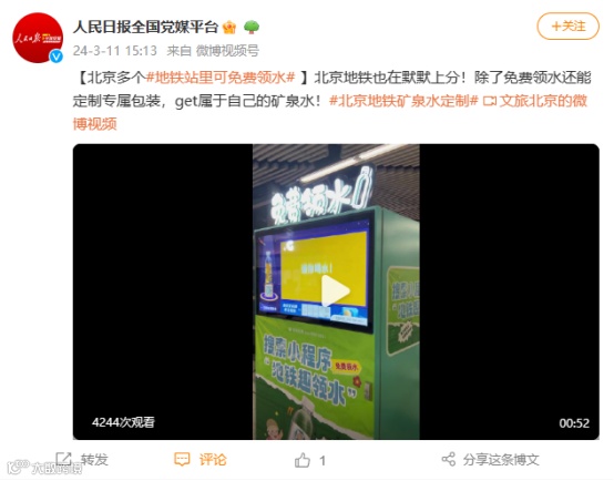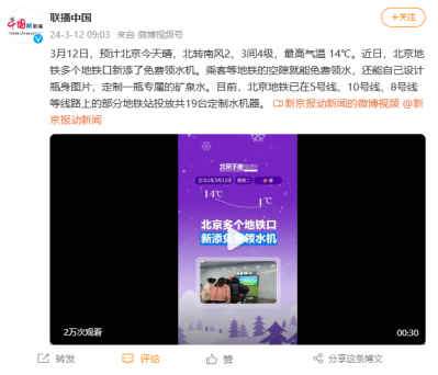 3月11日—15日,人民日报、光明网、中国网、首都之窗、北京市政府新闻办公室北京发布、北京日报、北京卫视、新京报、北京晚报、民生周刊、北京新闻广播等数十家央媒官方和地方主流媒体对在地铁为广大市民乘客提供免费领水服务的茄豆科技免费领水机进行了相继报道,这使茄豆科技免费领水机的全网“关注度”直接拉满,迅速登上百度热搜民生榜第15、同城榜第10,同时霸榜微博热搜同城第1,赢得众多网友的热烈欢迎和一致好评,茄豆科技免费领水机又双叒一次火爆出圈了!