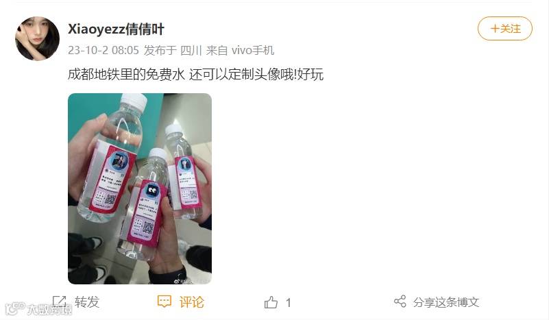 广大市民们对成都地铁和茄豆智能互动终端这一免费领水服务的便民举措赞不绝口,他们会自发晒出领取的免费瓶装水,并分享喜悦心情到抖音、小红书、微博等多家自媒体平台,形成相关热点话题。