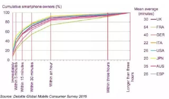 触屏智能手机的流行只有区区八年,但已逐渐成为人们离不开、放不下的“依靠”。一项研究显示,在英国,人们每天要扫手机10亿次,60%的人在清醒时每15分钟看一次手机。(见下表)