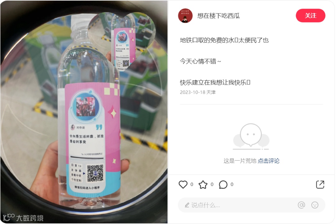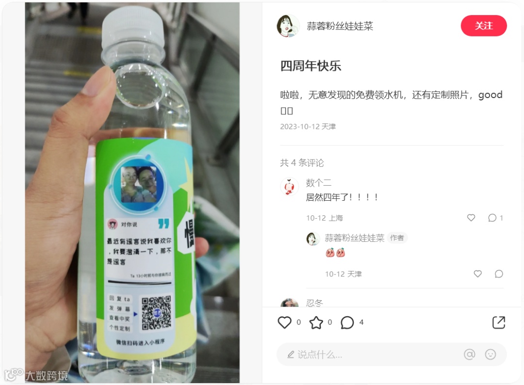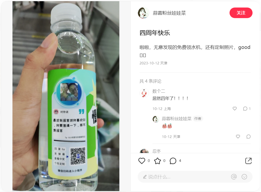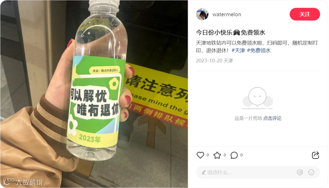 自茄豆科技自主研发的茄豆智能互动终端进驻天津地铁正式开启创新性的免费领水服务以来,赢得了广大天津市民的热烈欢迎和一致好评。出行市民们对天津地铁这一免费领水服务的便民举措赞不绝口,现场领取的瓶装水瓶身上还会有用户留言、生活语录、名言感悟等多种互动形式,极大的与领水者产生精神和情绪共鸣,他们会自发晒出领取的免费瓶装水,并分享喜悦心情到抖音、小红书、微博等多家自媒体平台,形成相关热点话题。目前,在各大社交平台晒免费瓶装水目前正在成为一种“新潮流”。