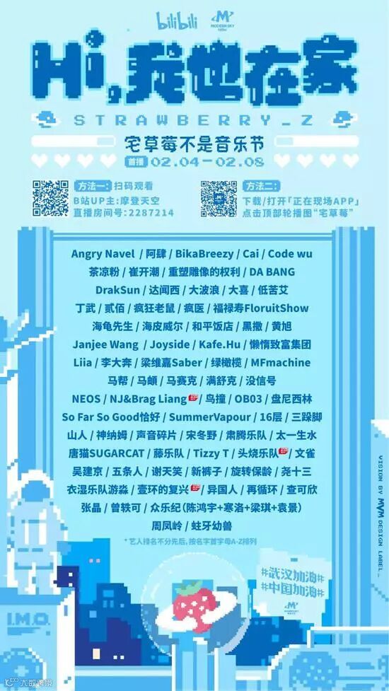 为此摩登天空与B站合作,线下“草莓音乐节”变身为“宅草莓”,主题也巧妙地增加了一个字,变为 “Hi,我也在家”。“宅草莓”活动连续直播5天,每天直播时长在6小时左右。