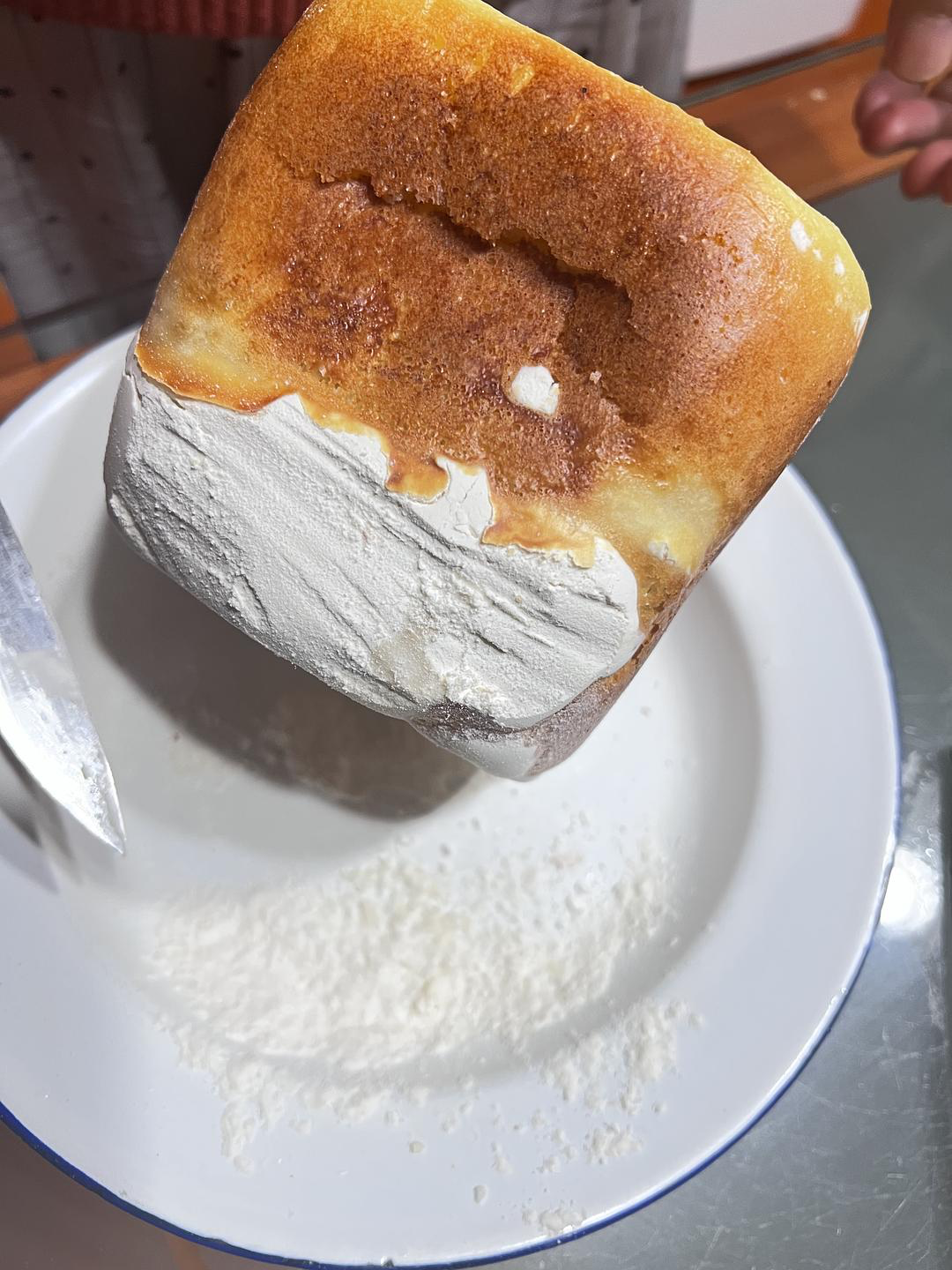 面包机里先放了面粉,然后是鸡蛋,牛奶,液体没有沉到底和面粉混匀,导致面包底部都是干面粉…