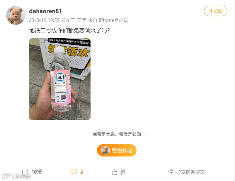 大量用户在领水后都自发在自媒体上进行分享,并对天津地铁和茄豆自助免费领水机都给予了高度评价!