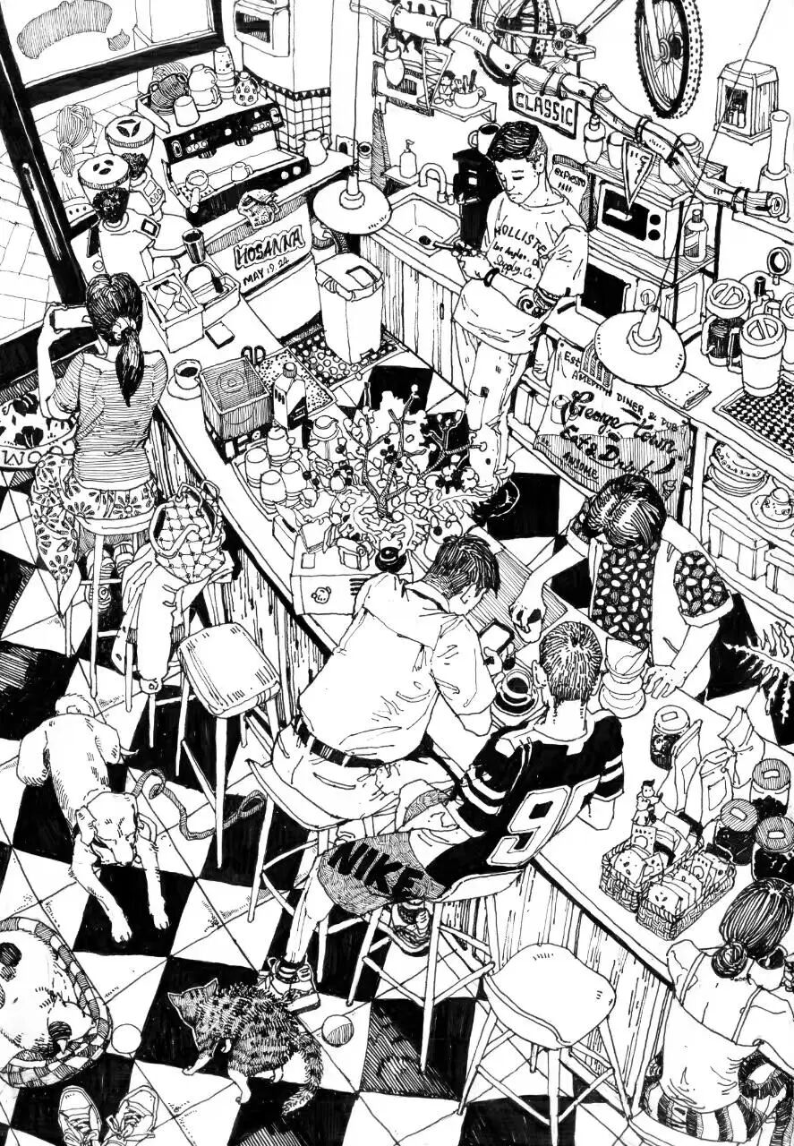 刘畅畅本科就读雕塑专业,艺术创作自然从雕塑开始。雕塑以外,她对绘画也颇有兴趣,绘画创作初期,由于专业课程安排,较少接触色彩,同时出于对“黑白画艺术家”比亚兹莱的喜爱,她的绘画作品多以黑白对比风格为主,用线条和留白勾勒出城市空间和生活场景的局部特写,其中复杂的细节呈现让人印象深刻。