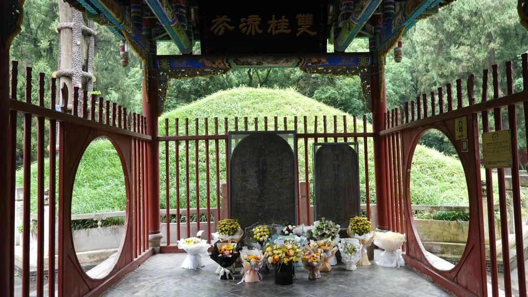 走到墓前,空地上整齐摆放着许多花束,花束上附着贺卡。景区导游说,这都是全国三国文化爱好者送来的,逢清明的时候,墓前会被花束铺满。