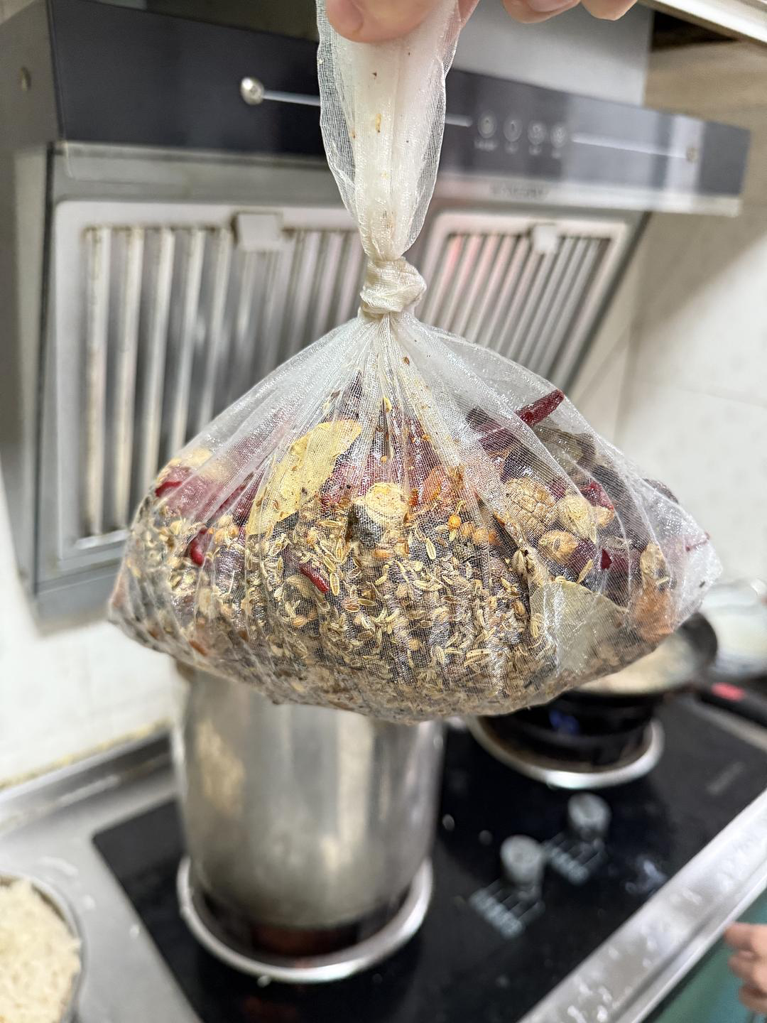 水开后放入卤包,卤包的具体材料在下面。这个卤包可以卤10升的水(20斤)。