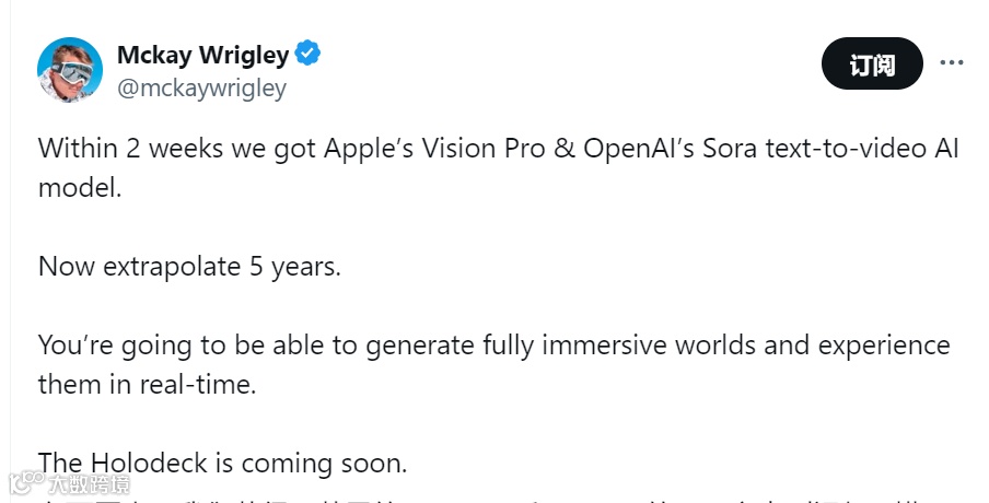 Takeoff AI是专注于AI Tools的创业公司,它的创始人认为这一波OpenAI新技术的最大受益者可能是虚拟现实。“在两周内,我们连续有了苹果的Vision Pro和OpenAI的Sora文本到视频AI模型。五年之后,你将能够生成完全沉浸式的世界,并实时体验它们。Holodeck(应该是指今年火爆的掌机Steamdeck的虚拟现实版本)很快就要来了。”