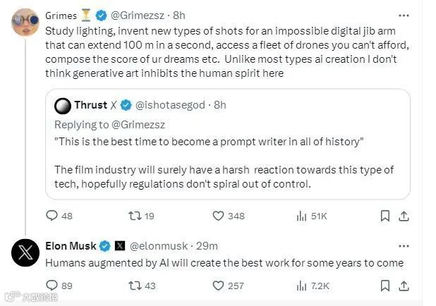 马斯克在其中一条帖子下回应称:“AI增强的人类将在未来几年里创造出最好的作品。”