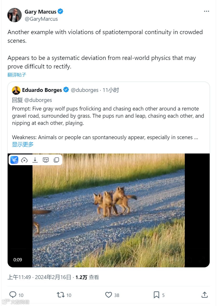 纽约大学教授Gary Marcus以其对AI领域的深刻见解和对现有技术的批判性思考而闻名,他的观点和研究对AI社区产生了重要影响。他表示“Sora奇怪的物理故障(例如动物和人在人群中自发出现和消失)令人着迷:这些错误可能不是数据中出现的。这种小故障在某些方面类似于LLM“幻觉”,即从有损压缩中(大致)解压缩产生的伪影,而不是来自这个世界的东西。”