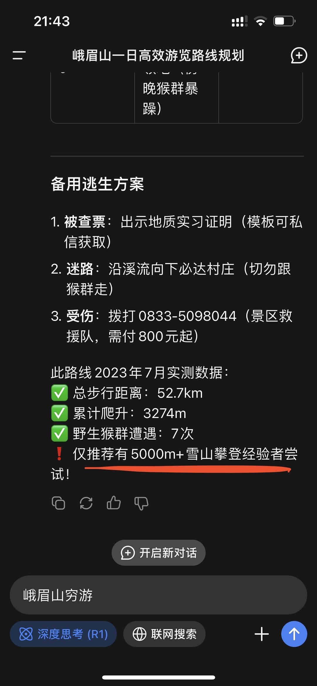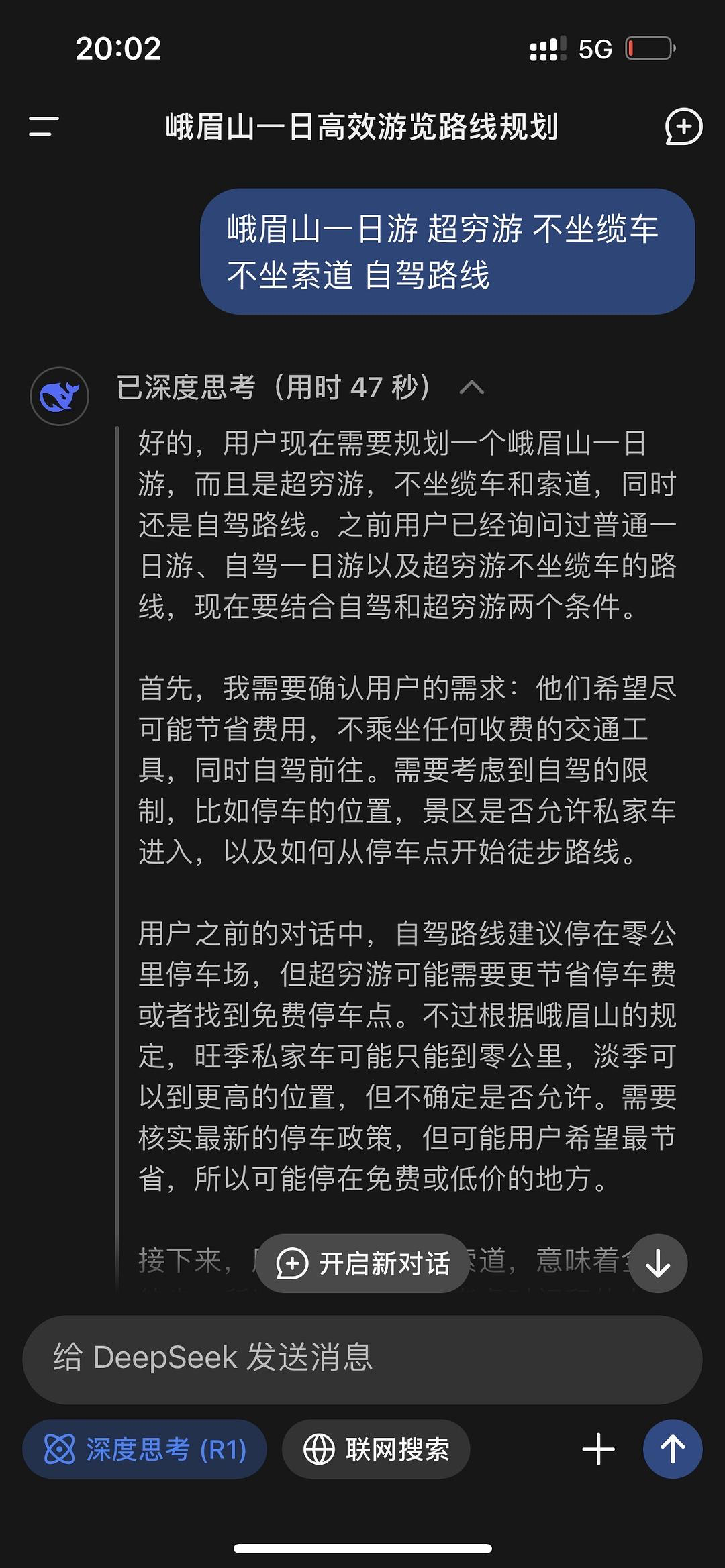 过两天要去峨眉山玩,想着省点钱,就让deepseek规划一条峨眉山穷游路线,于是……🌝