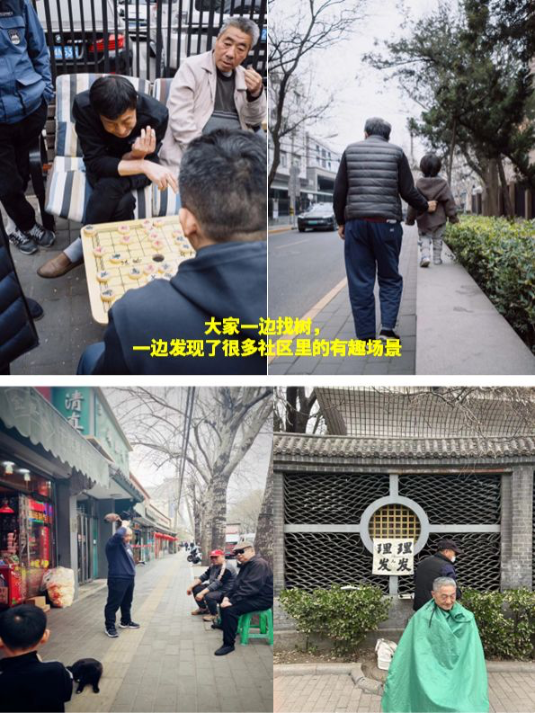 游戏过程中,参与者们对麦子店街区的树木种类有了更为具体的了解,还发现了很多有趣的场景和细节——在这个有三十余年历史的成熟社区里,大爷们的棋盘、栏杆上的刻字、地上的奇怪贴纸都记录着这个社区生活的细碎痕迹。