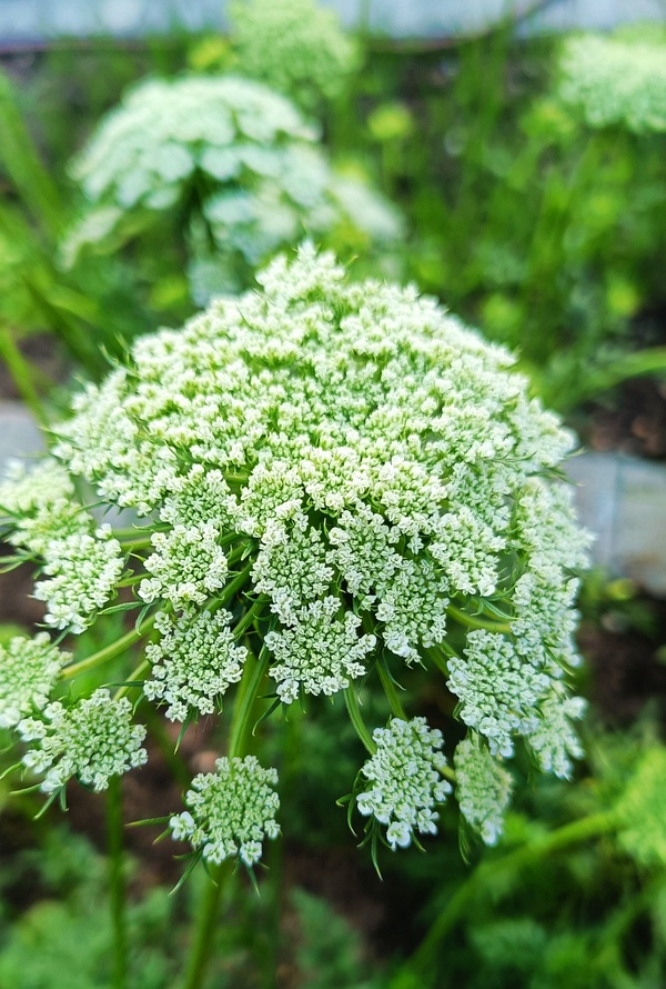 但其中一种长得格外浓密油绿健壮,却一直没有长花骨朵的迹象。某天扒开浓密的叶子一看,竟然是胡萝卜!!