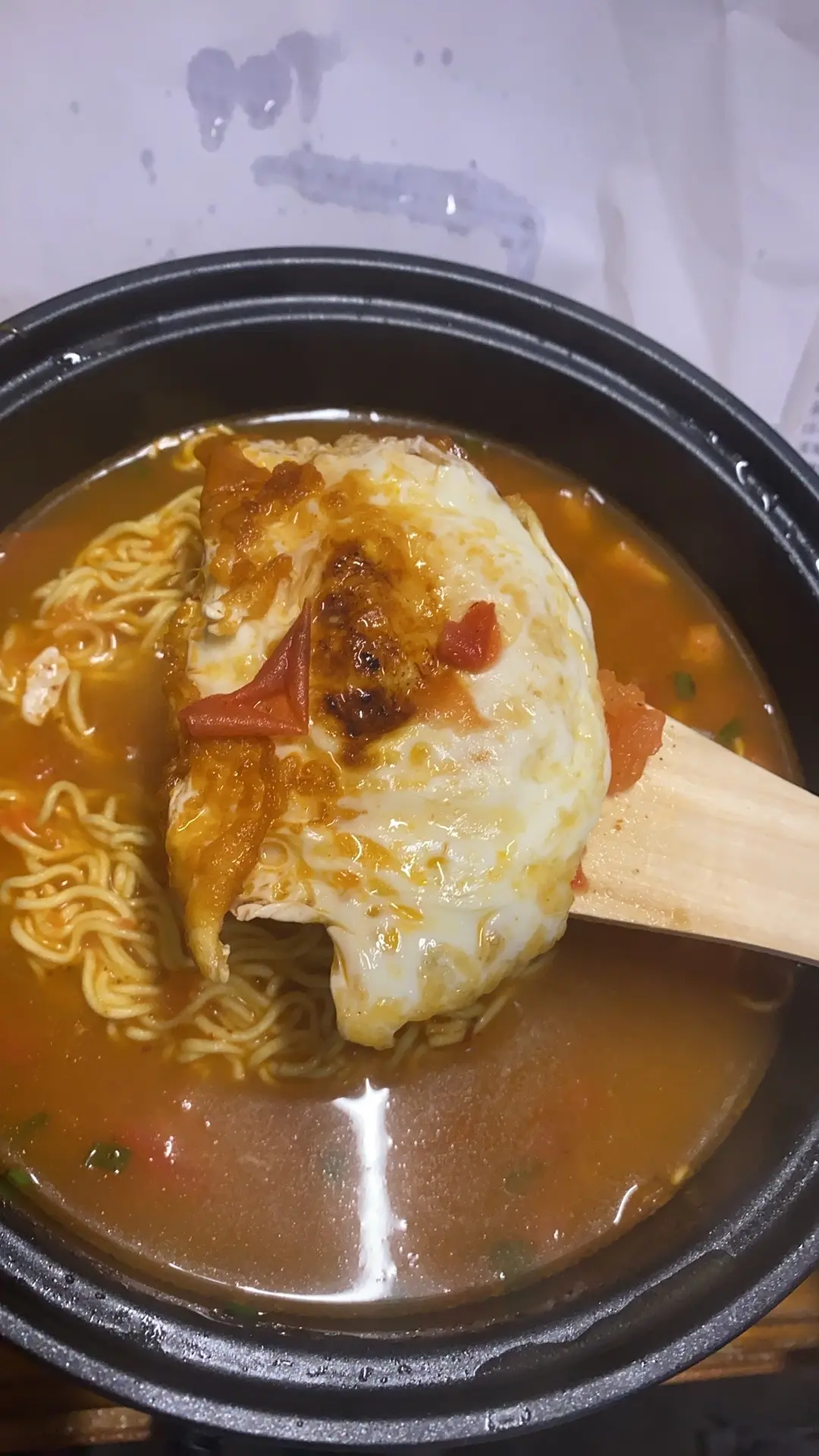 我煮的是香辣牛肉面,先煎一个鸡蛋,再把一个西红柿切成小块(我真的很喜欢吃西红柿),炒出沙,如果是肉番茄,汁比较少,不好出沙,就稍微加一点水,不停地按压西红柿丁,炒出番茄酱的感觉,再把方便面料包倒进去炒炒。加水,水开了就能下面。