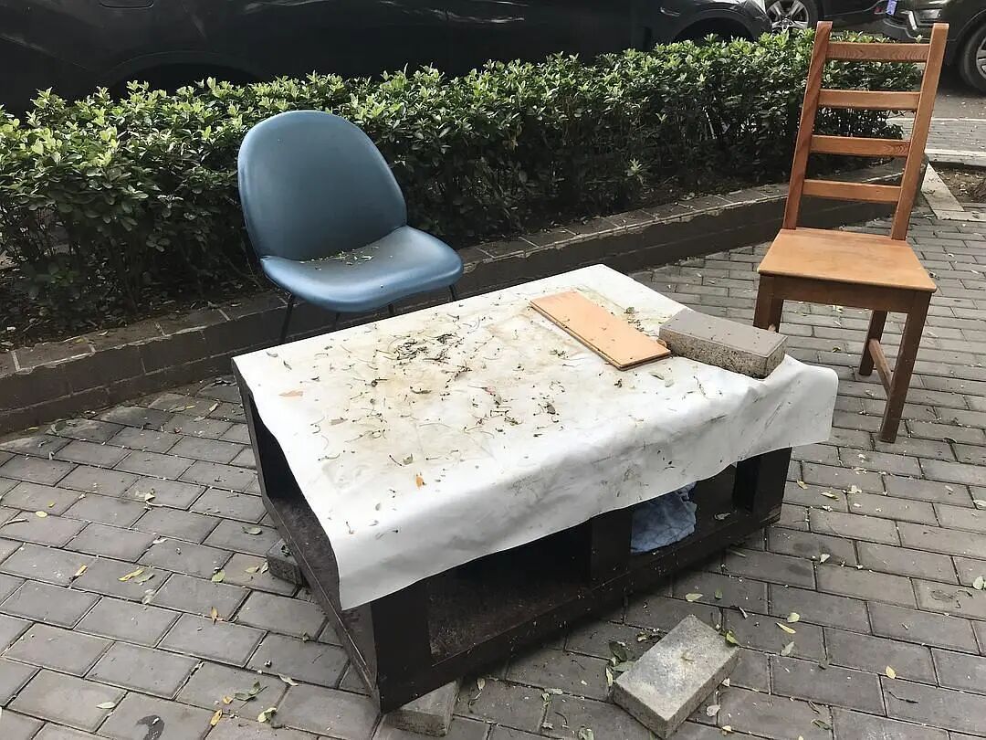 胡同里对坐的两把椅子和桌子,或许是下象棋的地方