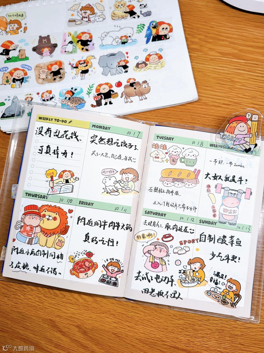 我有一本周记录本,每天我会把当日印象深刻的事情记下来,配上花花绿绿的贴纸,在书桌前一坐就是两三个小时,沉浸式记录,回头翻看的时候,也很有趣。