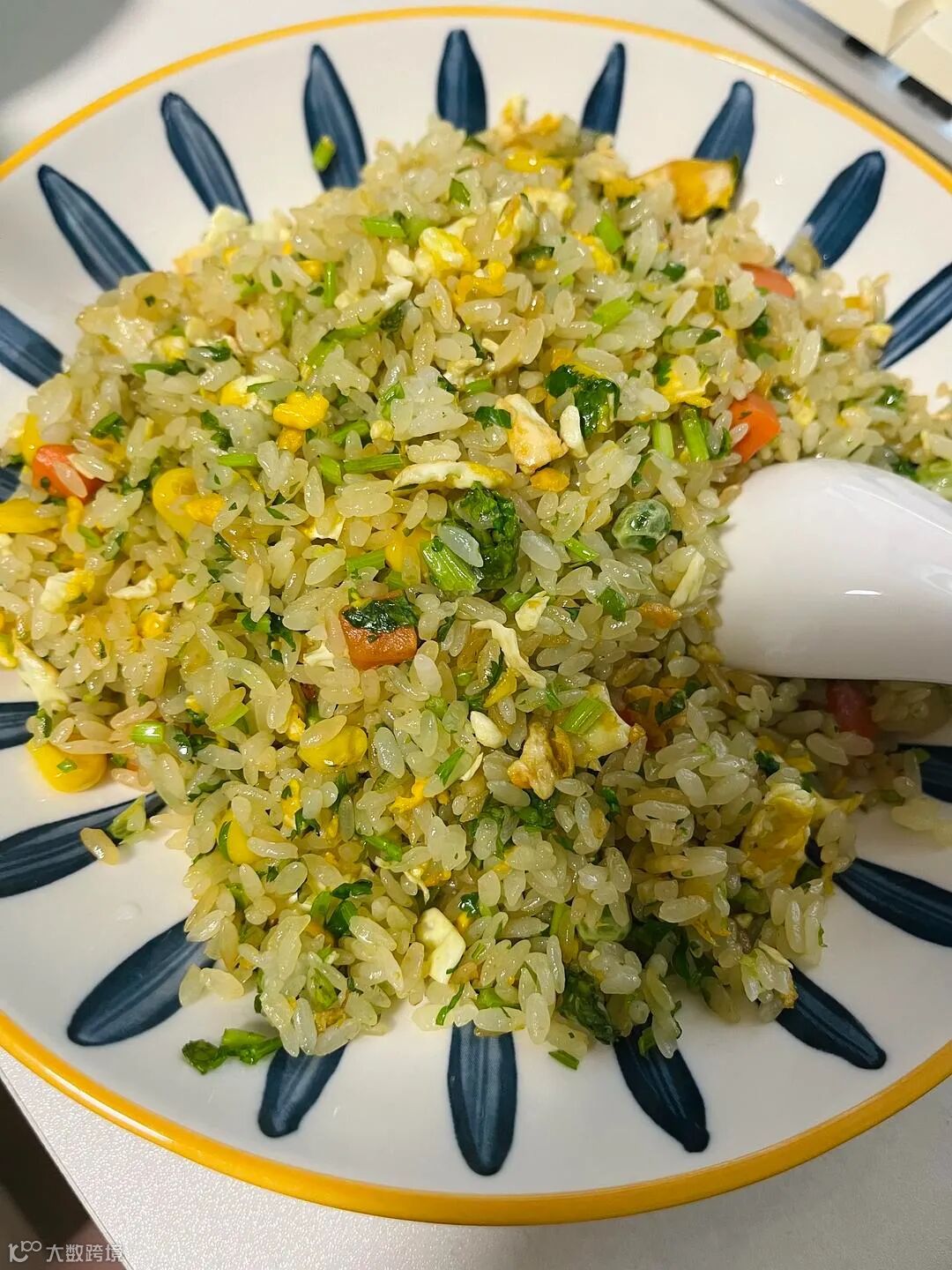 虾仁五花肉丁洋葱豌豆蛋炒饭