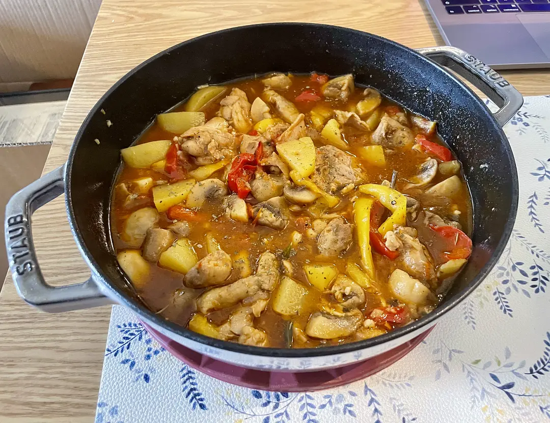 地中海料理,基本不用什么调味,靠番茄和彩椒的蔬菜酸甜味炖鸡,相当健康好吃