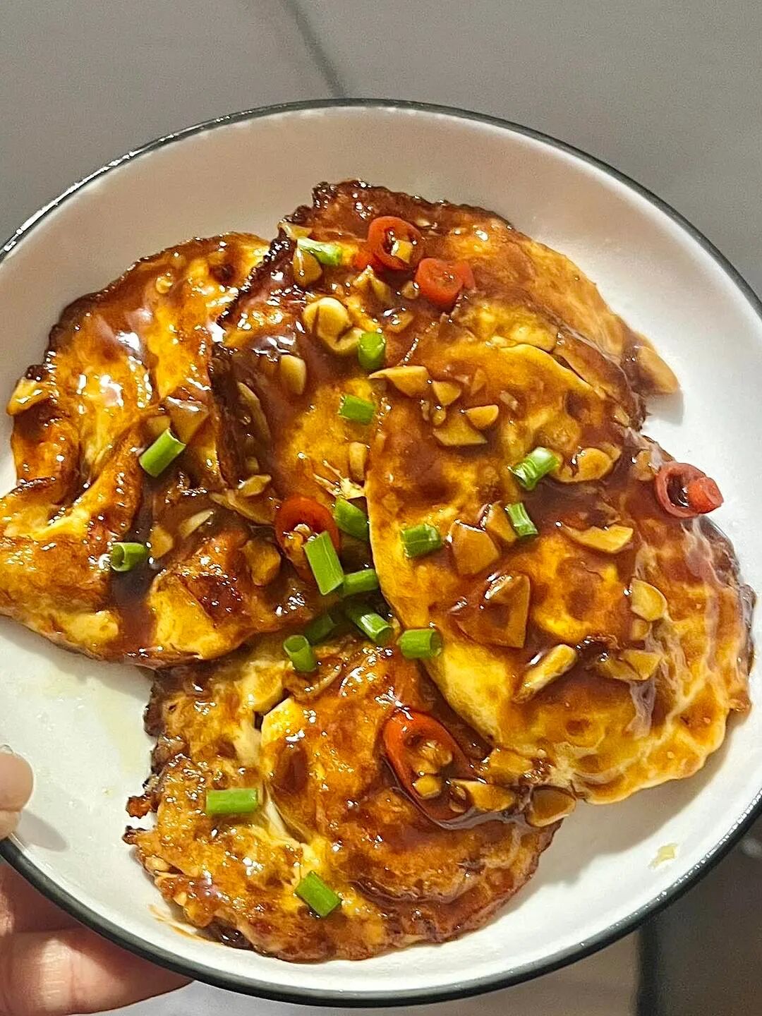 酱汁:两勺生抽半勺老抽一勺白糖一勺醋少许盐少许番茄酱少许淀粉三勺清水 步骤:先将鸡蛋煎至两面金黄(煎老一点好吃) 锅内留少许油放蒜末爆香 然后倒入酱汁加热至浓稠状 倒入鸡蛋翻炒均匀 就可以啦~