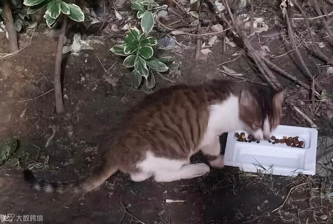 所以俺只能远远地看着他,看着崽饿得惨,我就让我家狗留守原地帮忙看着猫(别学,我家狗从小被我系统教学过,很听从指令,且那个时候小区绿化带处内无人,猫出现的地点就在我家楼下几十米处,一上一下只要两三分钟),上楼去拿狗粮临时给小猫崽顶一下,嚯,好家伙,吃得贼欢,叫得更响亮了。