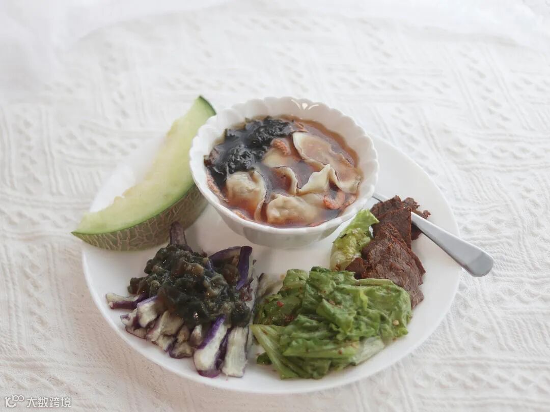 酸黄瓜牛肉粒拌荞麦面+番茄蛋汤+蜜瓜一片