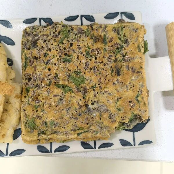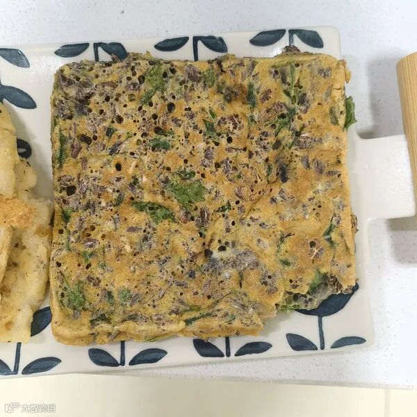 所有食材打在碗里拌匀,等5分钟麦片吸水会涨开,倒在三明治机里,煎至两面金黄出锅。