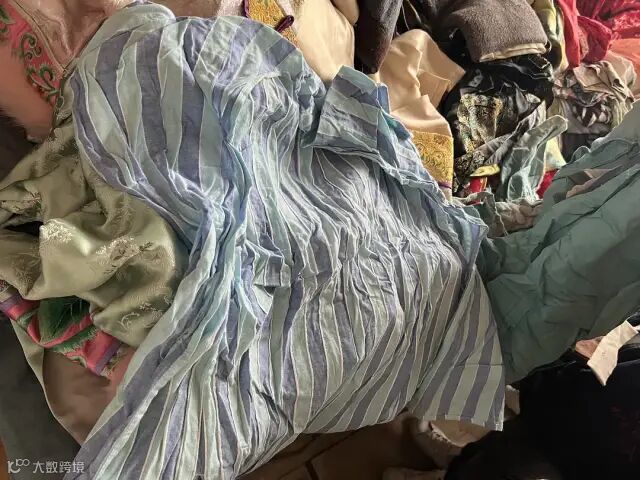 所有的服装都在一张桌子上堆放着,有的已经褪色,钙化。