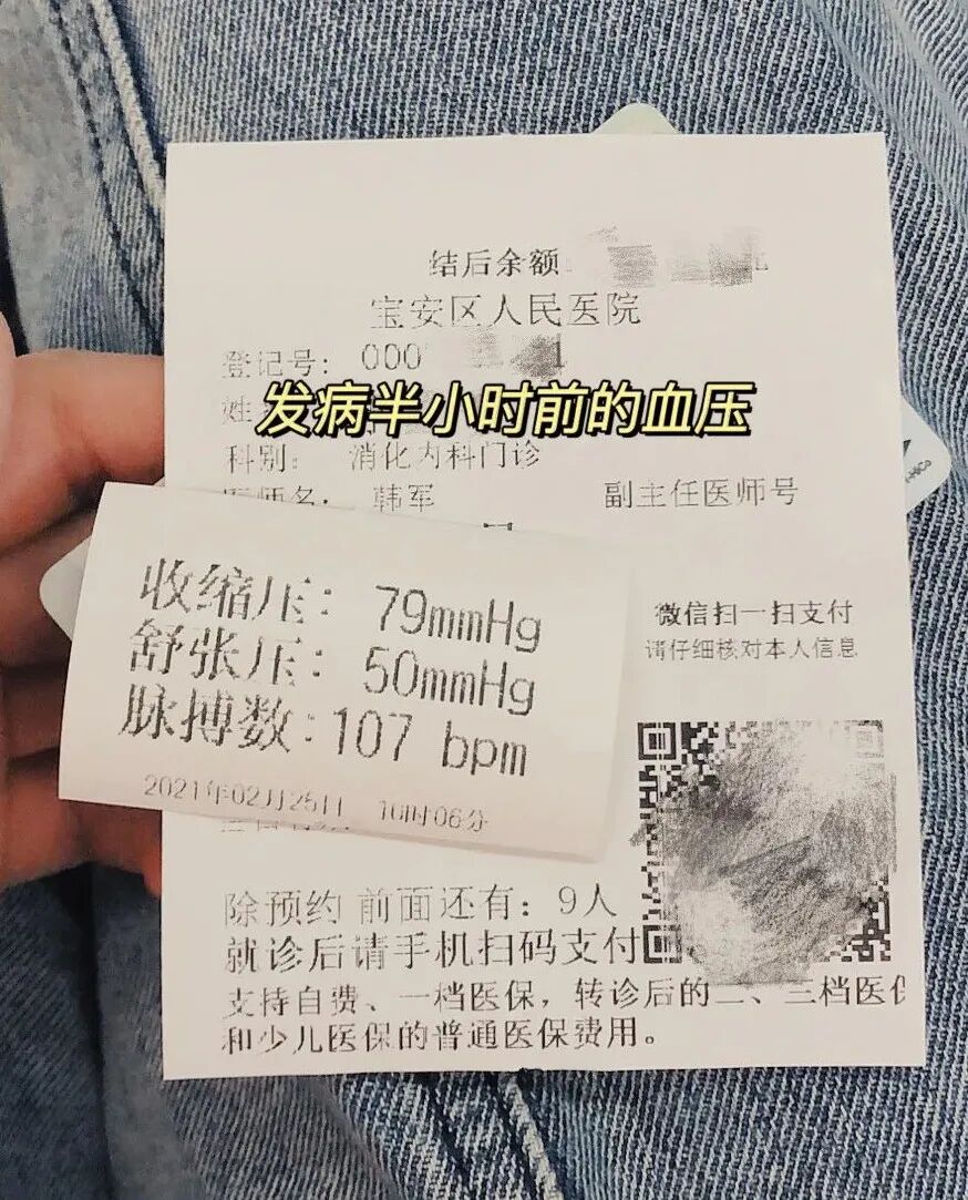 -血压、心率异常,发病前半小时我刚好在门诊量了血压,高压79,低压50,心率107;