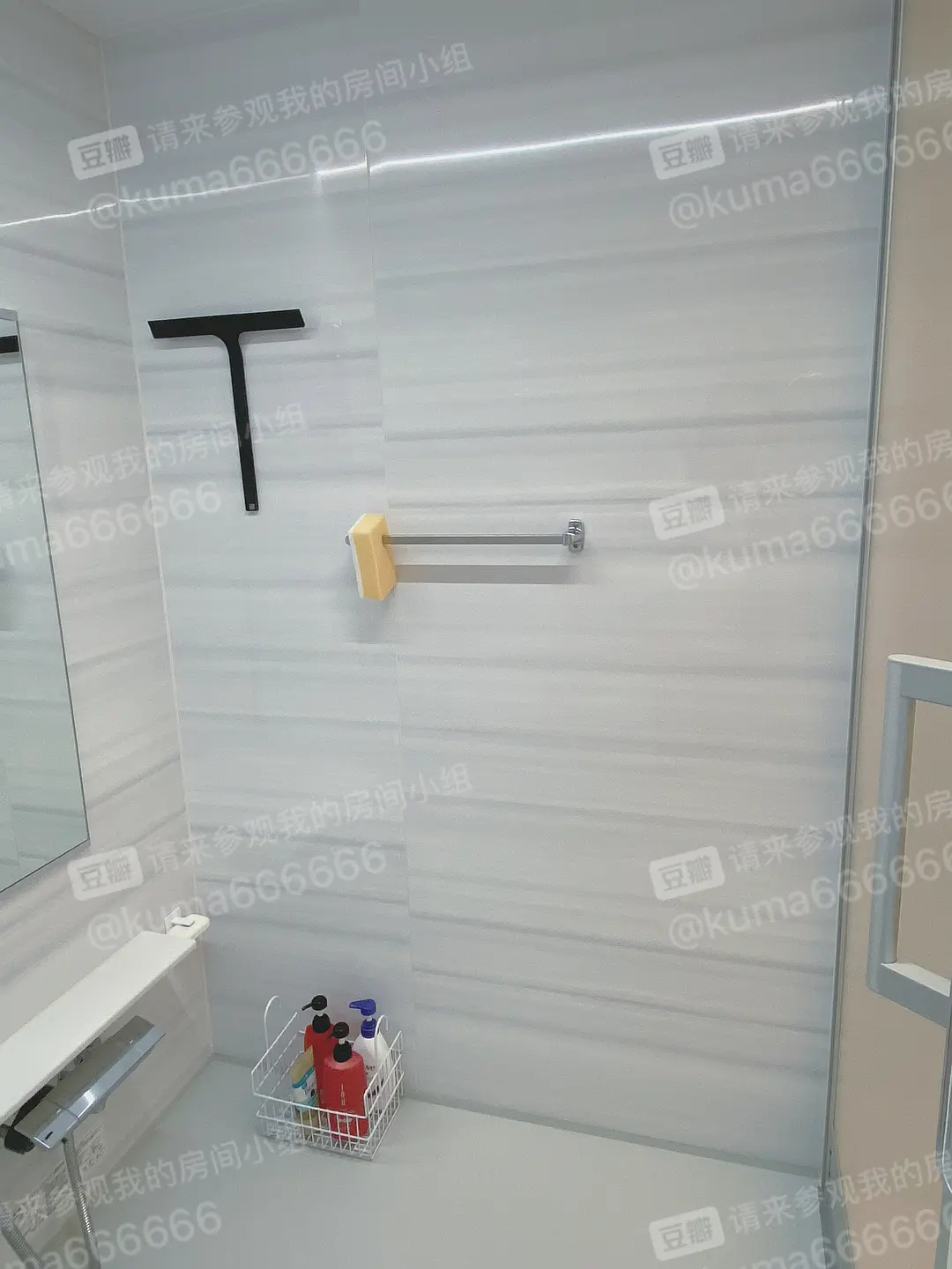 淋浴区。墙壁有磁性,所以买了磁吸的刮水和固定肥皂的吸在墙上。