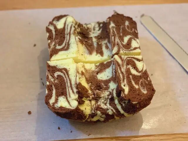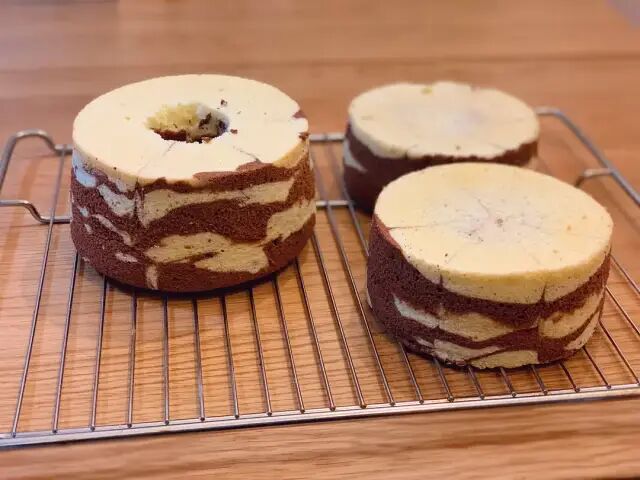 也可以加可可粉做成斑马纹戚风或者大理石戚风。很有意思,每个切开都像开盲盒一样。