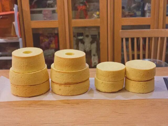 第一次做这么多戚风,家里五个模具都用上了,烤了四炉。