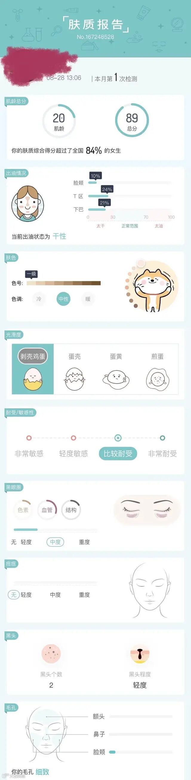 三、早晚清水洗脸。不涂任何护肤品。不化妆(其实楼主这样有点极端。检测报告可见皮肤有点干。但是我比较懒,我个人不觉得干,那就能不涂就不涂。而且!!!楼主发现,如果涂了护肤品皮肤就会依赖,不涂了就会干的难受)