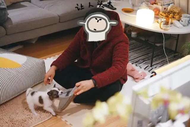满月之后,狗子开始乱窜了,怕在屋子里着凉,想尽办法给它保暖。买不到合适的小衣服,男朋友妈妈在布料市场挑最柔软的面料,手工缝制了几件。