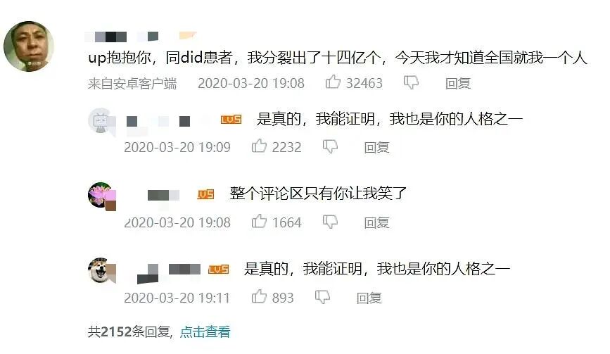 B站有个15岁的中二少女讲自己有30个人格的哈哈哈哈下面有一个评论真的是笑翻了,说“我也有多重人格,我有14亿个人格,今天我才知道全中国就我一个人” 哈哈哈哈哈哈哈哈这个真的太好哈了!!!!底下的留言也很好哈哈哈哈哈哈哈