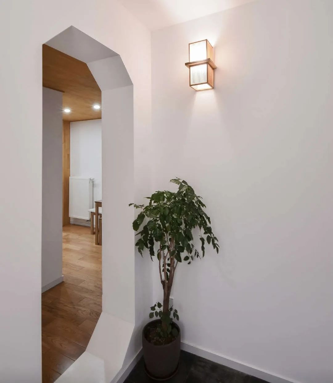 客厅原本有一根壁柱凸出来,所以设计师索性用石膏板沿壁柱的厚度,包出来一个窄窄的展示柜,出现一个中空的双层墙,双层墙的窗口正对侧院里的竹子。