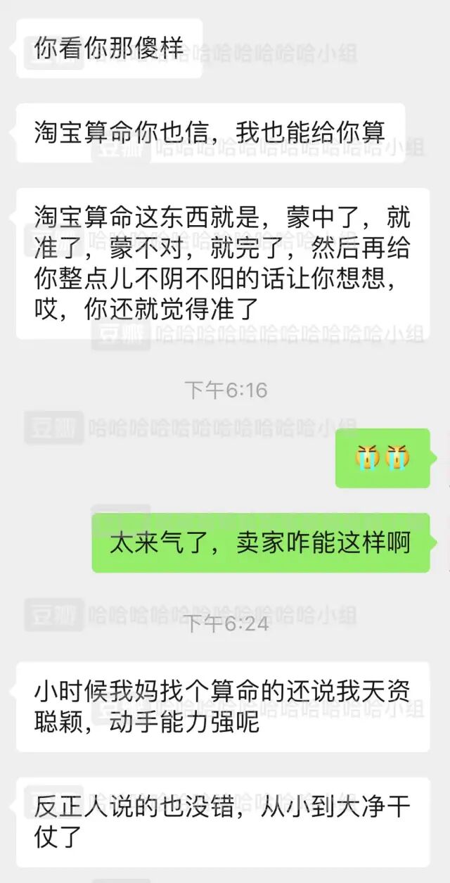 在tb下了个占卜单,第一个老师说的不准,换了第二个老师跟我说,你工作很大阻碍解决很困难,然后我问是啥阻碍,他就告诉我让我退款,不给我服务了!!!