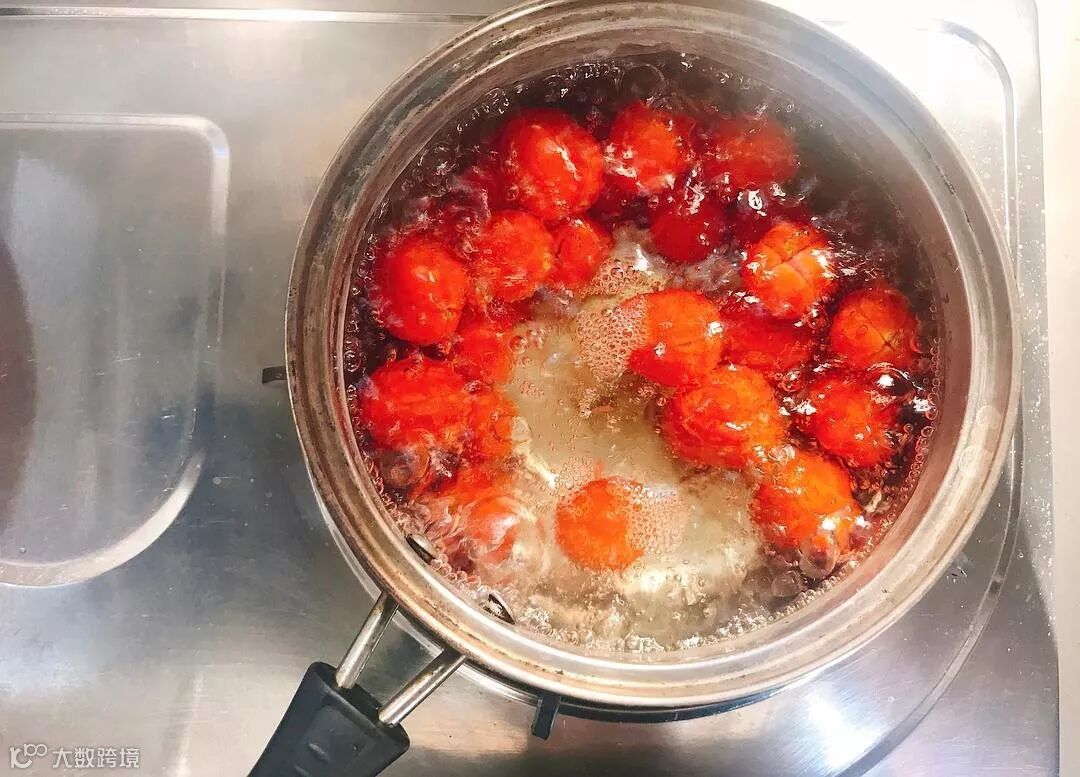 2、烧一锅热水,沸腾了就关火,再把处理好的番茄放水里。大概10~15秒后,番茄的皮会以肉眼可见的速度开始有剥离的迹象,这时候就可以捞出来。