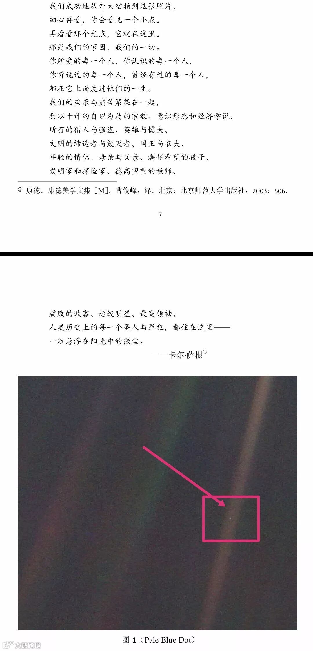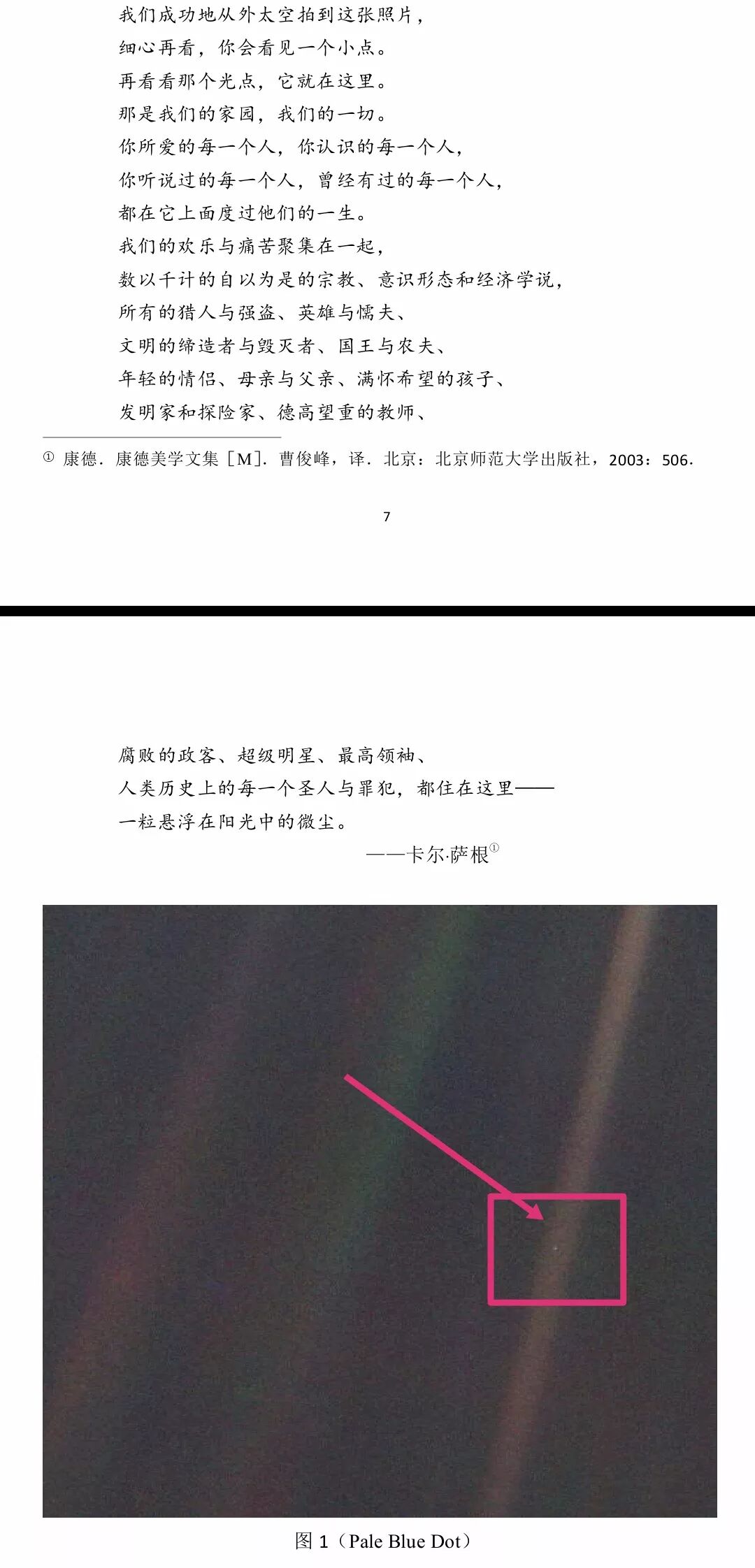 卡尔萨根在《暗淡蓝点》(The Pale Blue Dot)中描绘旅行者号照片的一段话。当时最震撼的就是其中一章提到的一系列让人类为之沮丧的“大降级”。以前就特别喜欢,后来在写一篇关于康德宇宙论和崇高美学的课程论文时还引用了。
