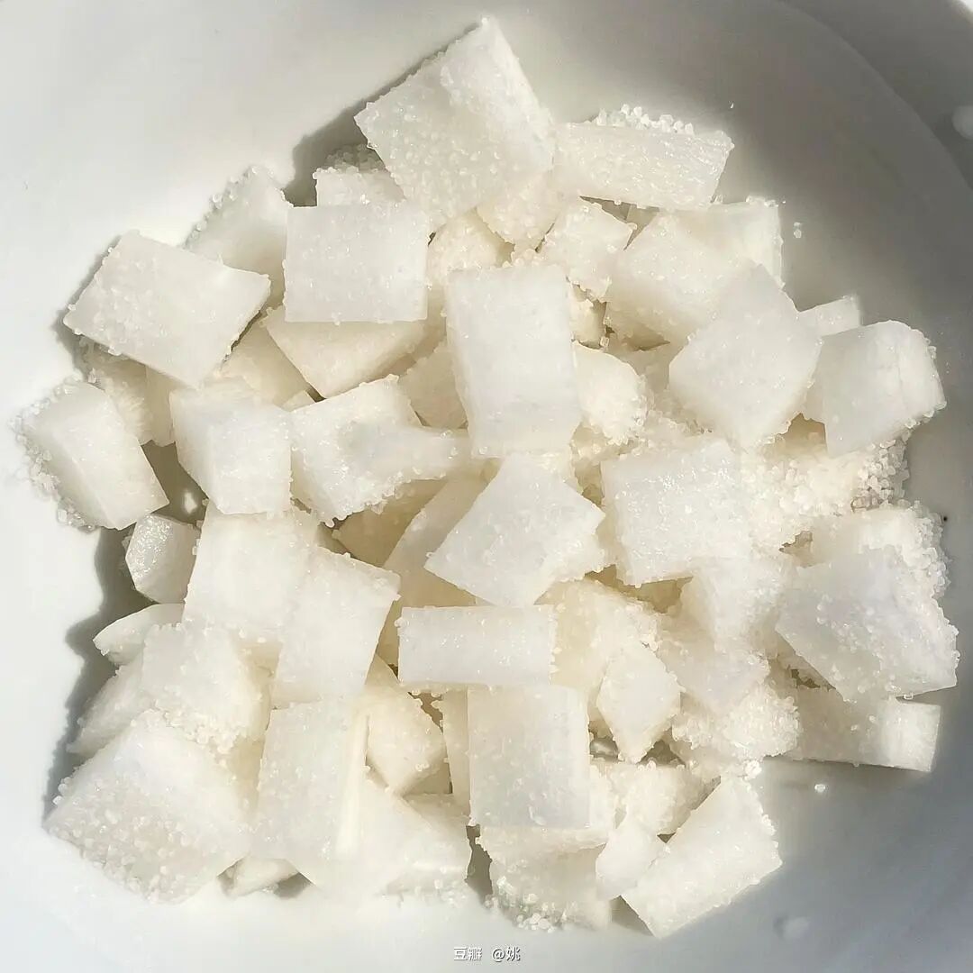 萝卜切片/粒/条(随意吧),用盐腌半个小时,萝卜出水后把水倒掉。