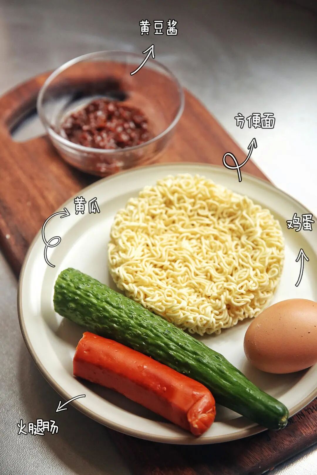 方便面 1块、鸡蛋1个、黄豆酱50g、生抽10ml、糖5g、黄瓜、火腿肠、小葱2根